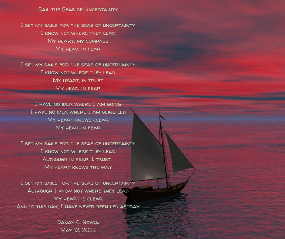 I've recently embarked on a new adventure, and although I have no idea what will happen, I'm excited to see how it will unfold. I trust that no matter what I'm always supported and guided. Recently, while discussing my new change with a friend, I said to her "I'm sailing the seas of uncertainty," she nodded in agreement. I knew just by that sentence alone that there was a poem brewing. Yesterday morning, I woke up with the words "my heart is my compass" in my mind. I knew it was time to write the poem.
